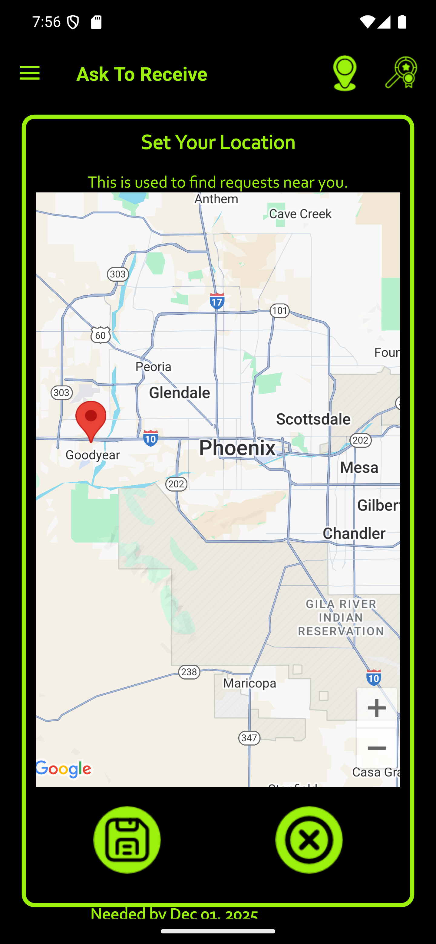After you install the app by following the instructions below, the first thing you need to do when you open the app is to set your location. This happens automatically to your current location, but during the beta test everyone needs to set their location to Goodyear, Arizona. That's because your view of the outstanding requests is limited to those within 25 miles of your location. By setting everyone to the same location, all of the requests and additional content will be viewable by all people.